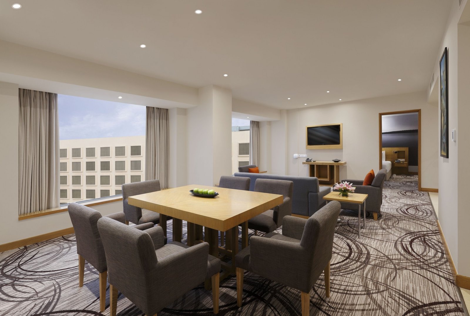 Novotel Hyderabad Convention Centre is located in Hyderabad's IT and Business district and is connected to South Asia's finest & largest pillar free convention centre - Hyderabad International Convention Centre, offering state-of-the-art exhibition, meeting and convention services. The hotel, located in HITEC City is 45 minutes drive from The Rajiv Gandhi International Airport and spread over 15 acres. It has been designed to provide a comfortable and a friendly environment for the business and leisure traveler. Key features are Hi-speed internet, Wi-Fi enabled rooms, award winning wine and dine options: Food Exchange, La Cantina, Le Cafe, The Bar, 24 hrs fitness centre, outdoor pool & jogging track and a spa/salon.