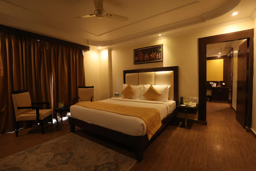 Amenities include a traditionally decorated vegetarian restaurant, a relaxed bar and a gym